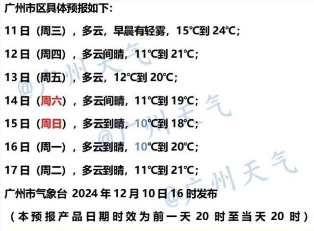 廣州市氣象臺預(yù)計,11日傍晚起廣州開始受到冷空氣影響,將出現(xiàn)大風(fēng)降溫天氣。12日至15日冷空氣持續(xù)補充,廣州氣溫將逐日下降,過程降溫5~8℃。預(yù)計15日和16日,廣州市區(qū)最低氣溫均僅10℃,14日和15日的最高氣溫也將降至20℃以下,介于19~18℃。