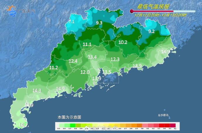 13-14日,廣東省大部多云,氣溫繼續(xù)小幅下降。最低氣溫:粵北和珠江三角洲北部5~9℃,南部沿海市縣13~16℃,其余市縣10~13℃。
