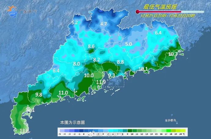 22日,中南部市縣晴到多云,其余市縣晴間多云。最低氣溫:粵北市縣4~7℃(高海拔山區(qū)零下2~2℃)、部分山區(qū)市縣有霜(冰)凍,南部市縣10~14℃,其余市縣7~10℃。