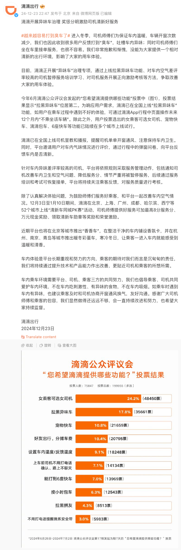 12月23日晚,@滴滴出行 發(fā)文稱(chēng),進(jìn)入冬季,司機(jī)為保證車(chē)內(nèi)溫暖,車(chē)輛開(kāi)窗次數(shù)減少,滴滴也因此收到很多用戶反饋打到“臭車(chē)”,吐槽車(chē)內(nèi)異味。