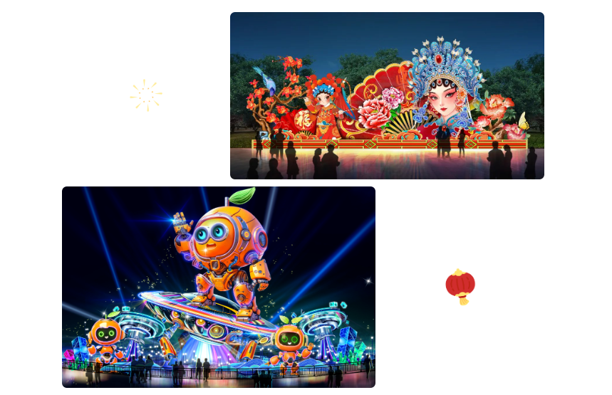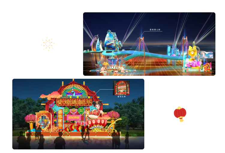 △分別為《賽博醒獅》燈組、《齊天大圣》原創(chuàng)燈組、《真心話大冒險》樂園燈組效果圖