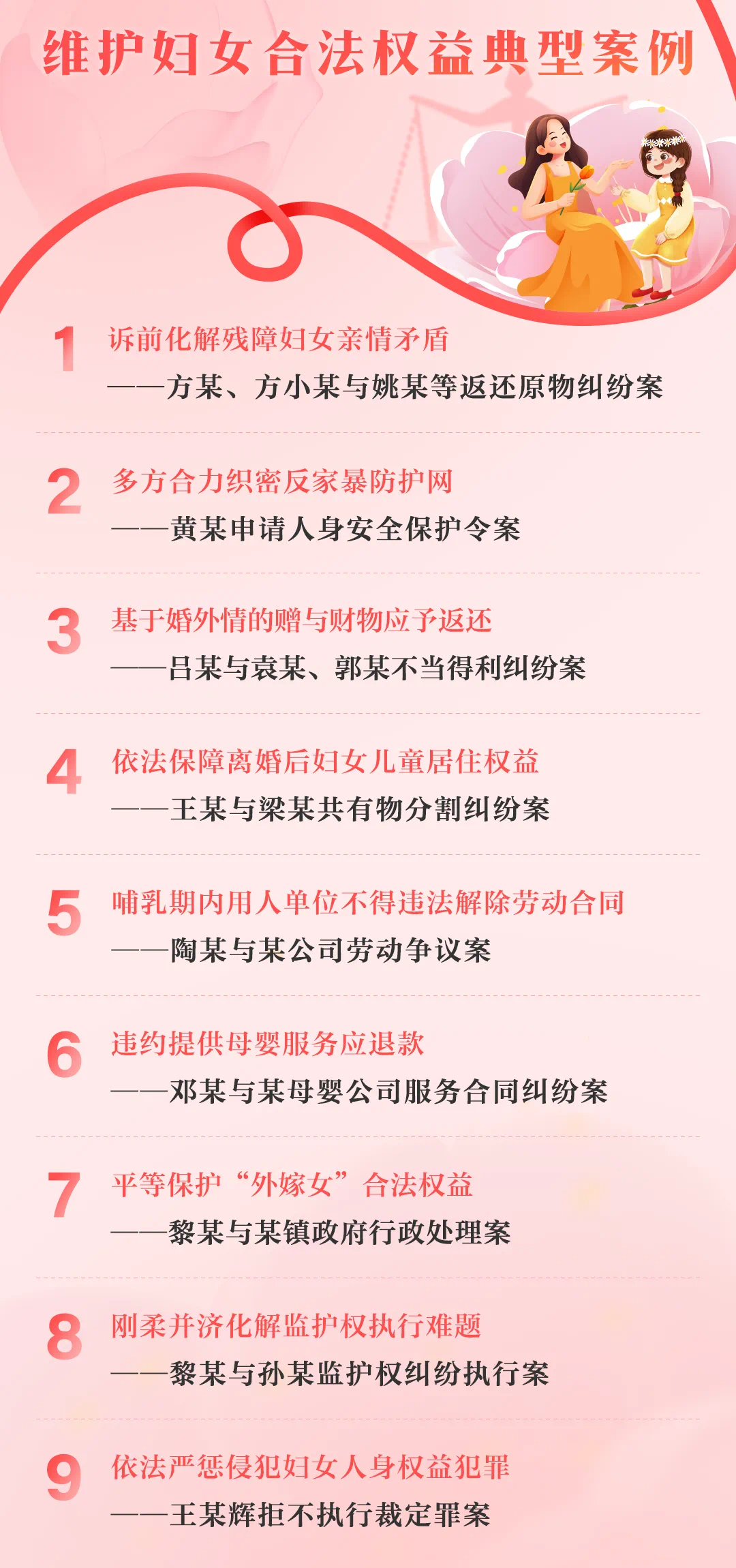 3月7日,廣東省高級人民法院、廣東省婦女聯(lián)合會聯(lián)合發(fā)布一批維護(hù)婦女合法權(quán)益典型案例,涉及婦女居住權(quán)益和生育期間勞動權(quán)益保障、“外嫁女”在集體經(jīng)濟組織中的合法權(quán)益保護(hù)、反家庭暴力和人身安全保護(hù)令等熱點問題,體現(xiàn)了廣東法院和婦聯(lián)切實維護(hù)婦女合法權(quán)益。