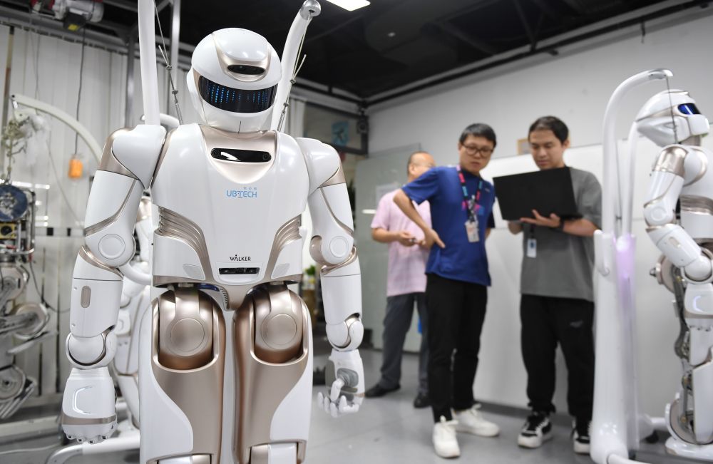 2024年6月26日,在位于深圳市南山智園的優(yōu)必選總部,工作人員對(duì)人形機(jī)器人進(jìn)行測(cè)試。新華社記者毛思倩 攝
