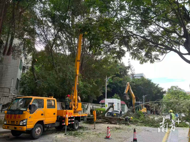 臺風(fēng)來臨前,園林部門工作人員正在對樹枝進(jìn)行裁剪。受訪者供圖