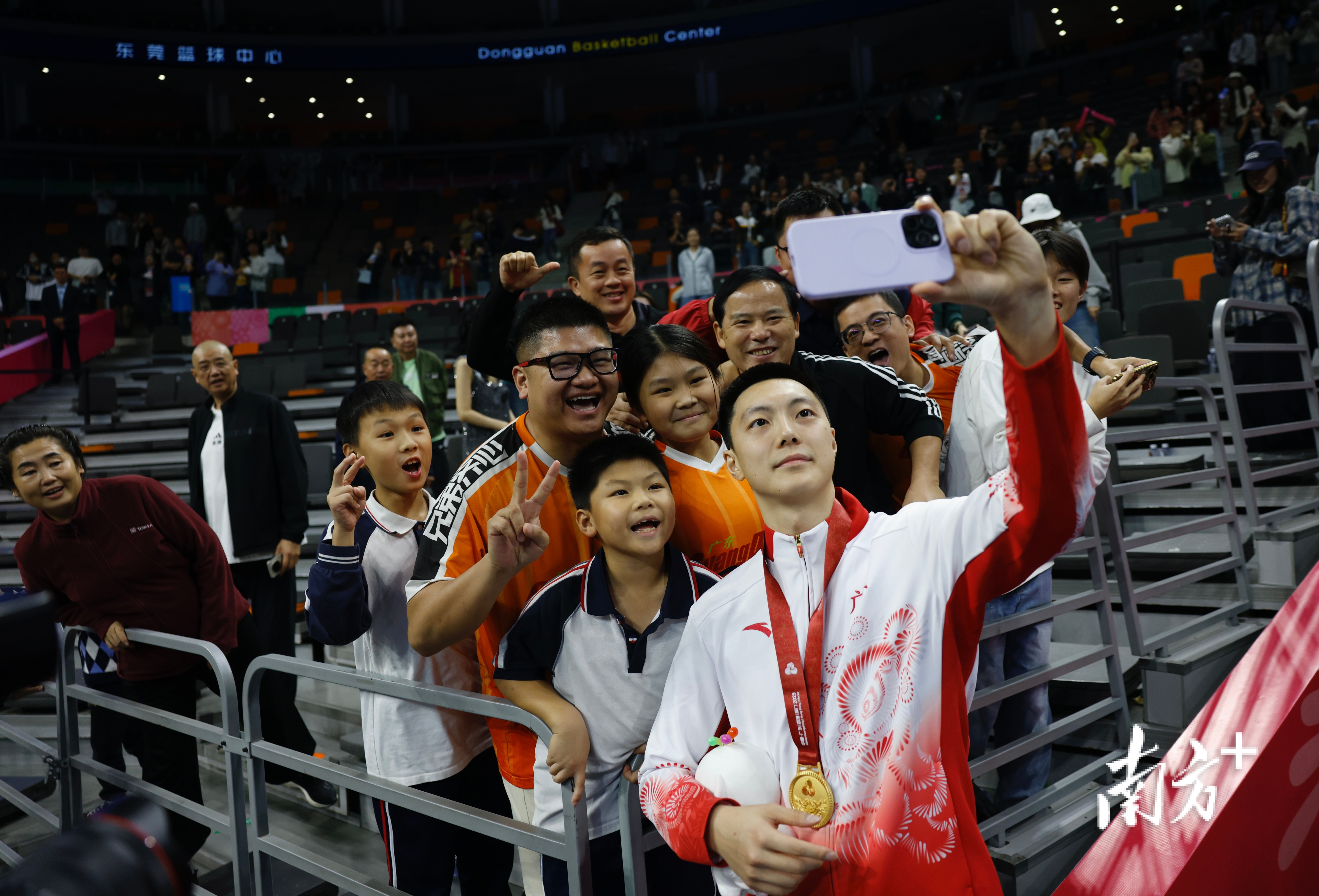 11月12日,十五運會男籃成年組決賽,廣東隊獲得冠軍后,胡明軒與球迷們合影留念。張由瓊 攝