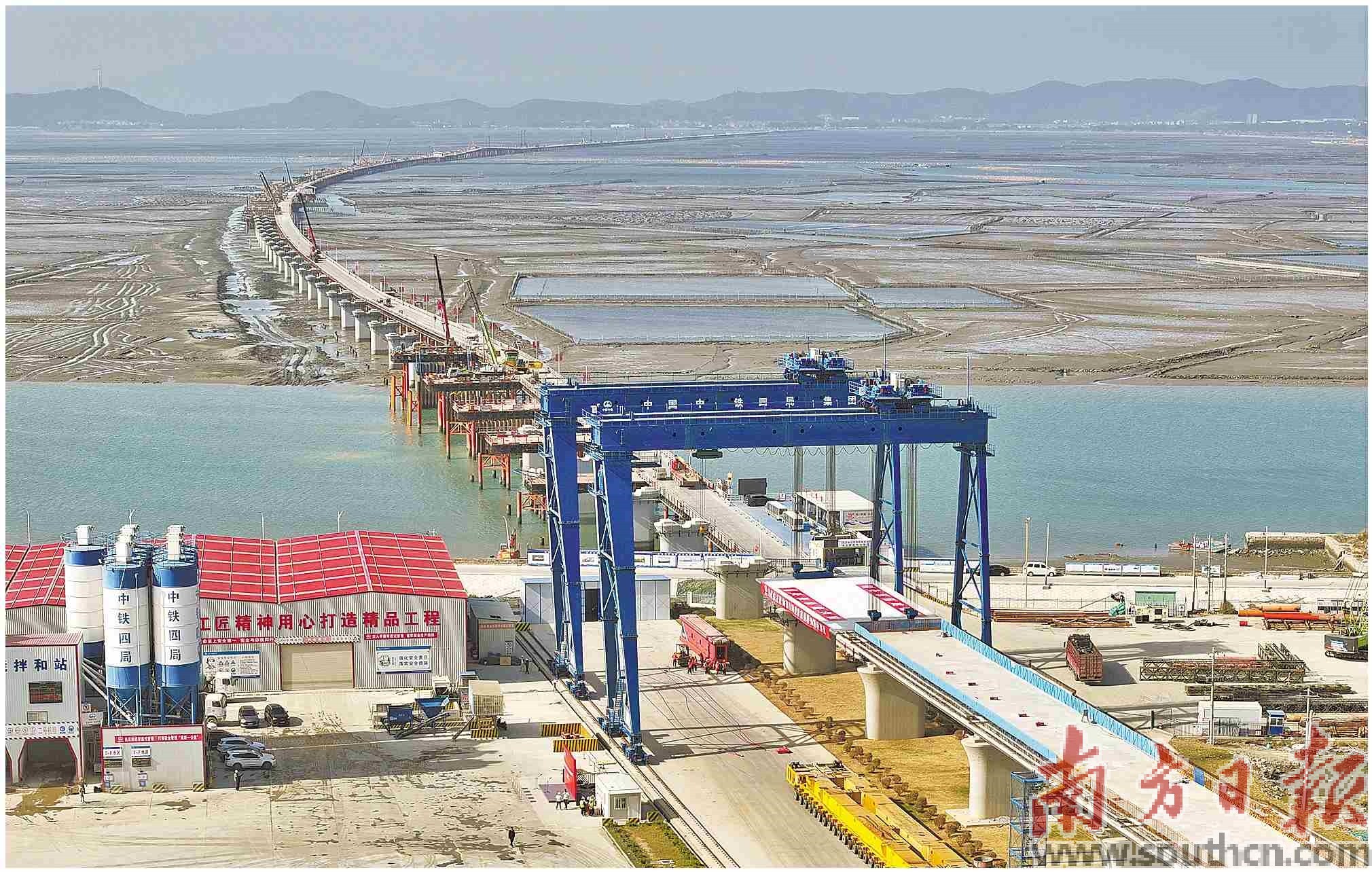11月26日,在漳汕高鐵福建段東山跨海特大橋施工現(xiàn)場,隨著一榀重達(dá)數(shù)百噸的箱梁精準(zhǔn)安放在橋墩上,漳汕高鐵全線進(jìn)入跨海大橋架梁施工階段。此次完成首榀箱梁架設(shè)的東山跨海特大橋全長20.26公里,是漳汕高鐵全線最長的跨海橋梁。