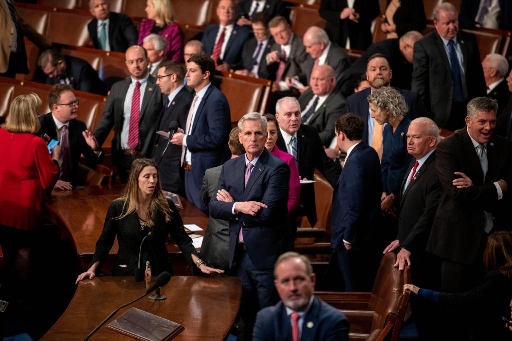 1月6日,在美國首都華盛頓,共和黨聯(lián)邦眾議員凱文·麥卡錫(中)在眾議院等待眾議長選舉表決結(jié)果。新華社記者劉杰攝