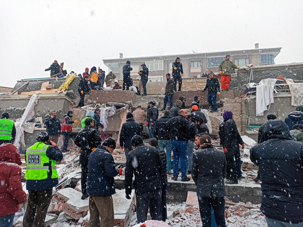 2月6日,人們?cè)谕炼漶R拉蒂亞一處倒塌的建筑上搜救。新華社發(fā)(穆斯塔法·卡亞攝)