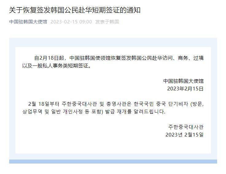 自2月18日起,中國駐韓國使領(lǐng)館恢復(fù)簽發(fā)韓國公民赴華訪問、商務(wù)、過境以及一般私人事務(wù)類短期簽證。