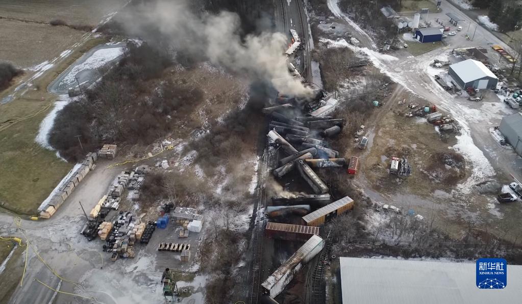 這張美國國家運(yùn)輸安全委員會發(fā)布的無人機(jī)視頻截圖顯示的是有毒化學(xué)品運(yùn)載列車脫軌事故現(xiàn)場。新華社發(fā)