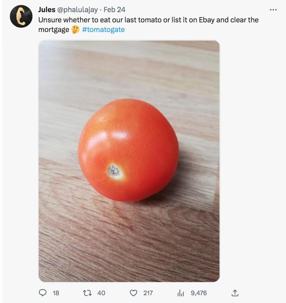 有英國網(wǎng)友在社交媒體上公布的賬單顯示,2月末他花費了25英鎊(折合人民幣206.53元)購買了一袋共6個西紅柿。還有英國網(wǎng)友調(diào)侃說,看著家里最后一個西紅柿,難以決定是把它吃掉,還是把它賣掉還房貸。