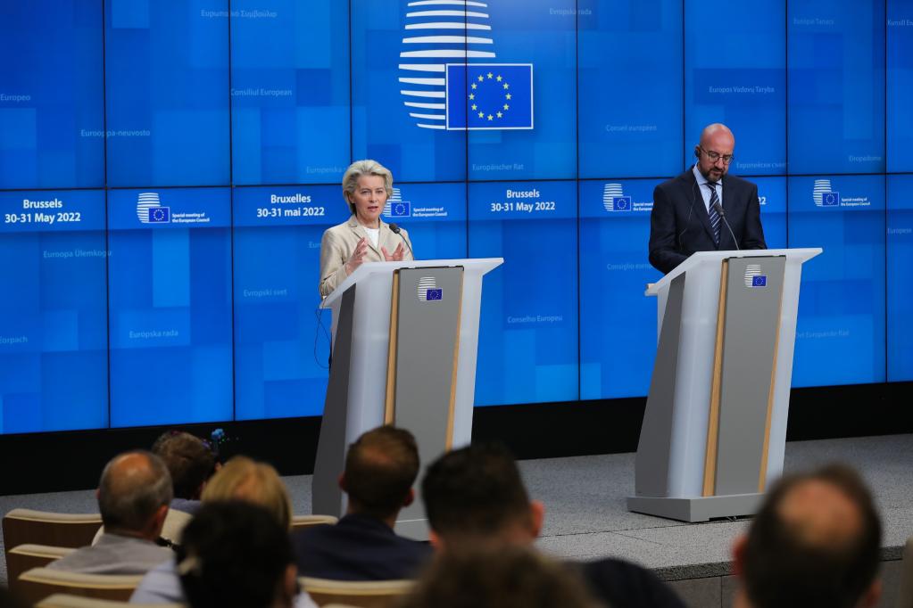 2022年5月31日,在比利時布魯塞爾,歐盟委員會主席馮德萊恩(左)和歐洲理事會主席米歇爾在歐盟特別峰會后舉行新聞發(fā)布會。本次峰會決定對俄羅斯實施石油禁運(yùn),并逐漸擺脫對俄羅斯能源依賴。新華社記者鄭煥松攝