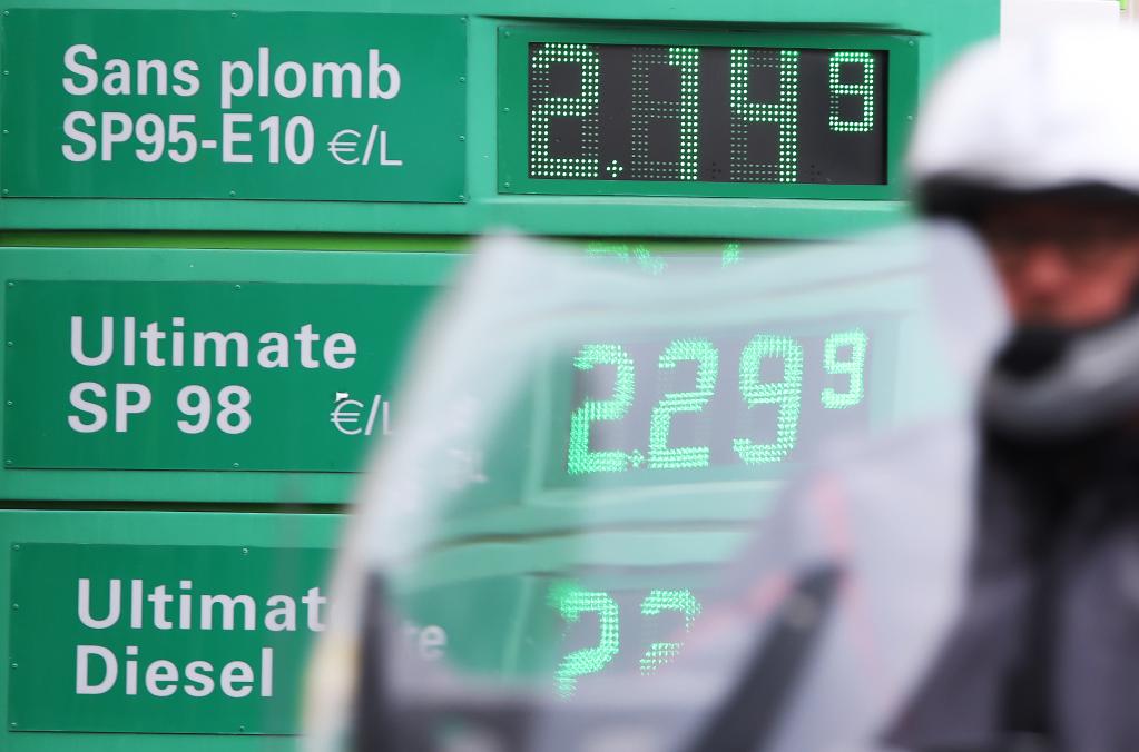 2022年3月16日,一名男子騎摩托車經(jīng)過法國巴黎一處加油站。新華社記者高靜攝