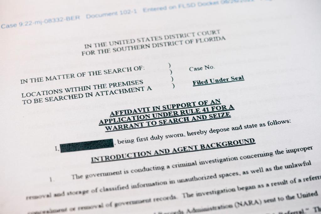 這是2022年8月26日拍攝的美國聯(lián)邦調(diào)查局申請搜查前總統(tǒng)特朗普住所海湖莊園時向法院提交書面證詞的部分內(nèi)容。新華社記者劉杰攝