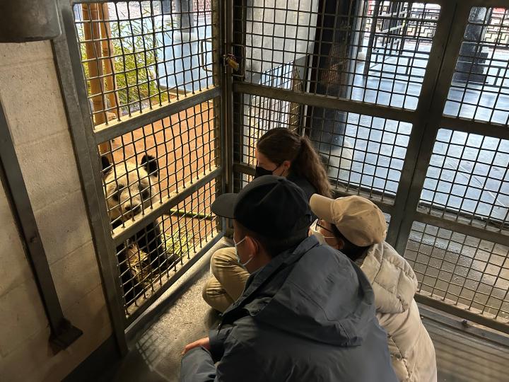 北京動物園工作人員和孟菲斯動物園工作人員一起同“丫丫”增進(jìn)熟悉度(4月11日攝)