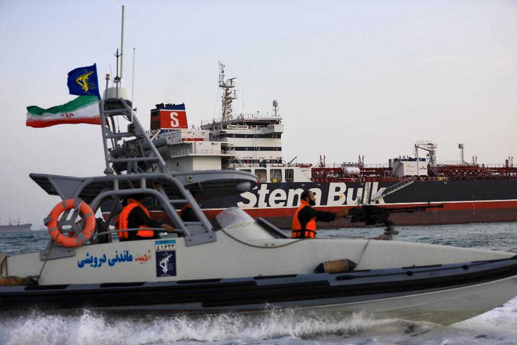 2019年7月21日,在伊朗霍爾木茲海峽附近,伊朗伊斯蘭革命衛(wèi)隊(duì)的船只在“史丹納帝國(guó)”號(hào)油輪周圍巡邏。伊朗官員21日說,伊方所扣押一艘英國(guó)籍油輪“史丹納帝國(guó)”號(hào)上的船員安全,伊方將依據(jù)規(guī)定調(diào)查這艘油輪。新華社/伊朗學(xué)生通訊社