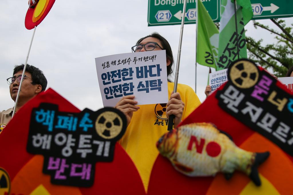 7月8日,民眾在韓國(guó)首爾手舉標(biāo)語(yǔ)牌參加集會(huì),反對(duì)日本核污染水排海。(新華社記者王益亮攝)