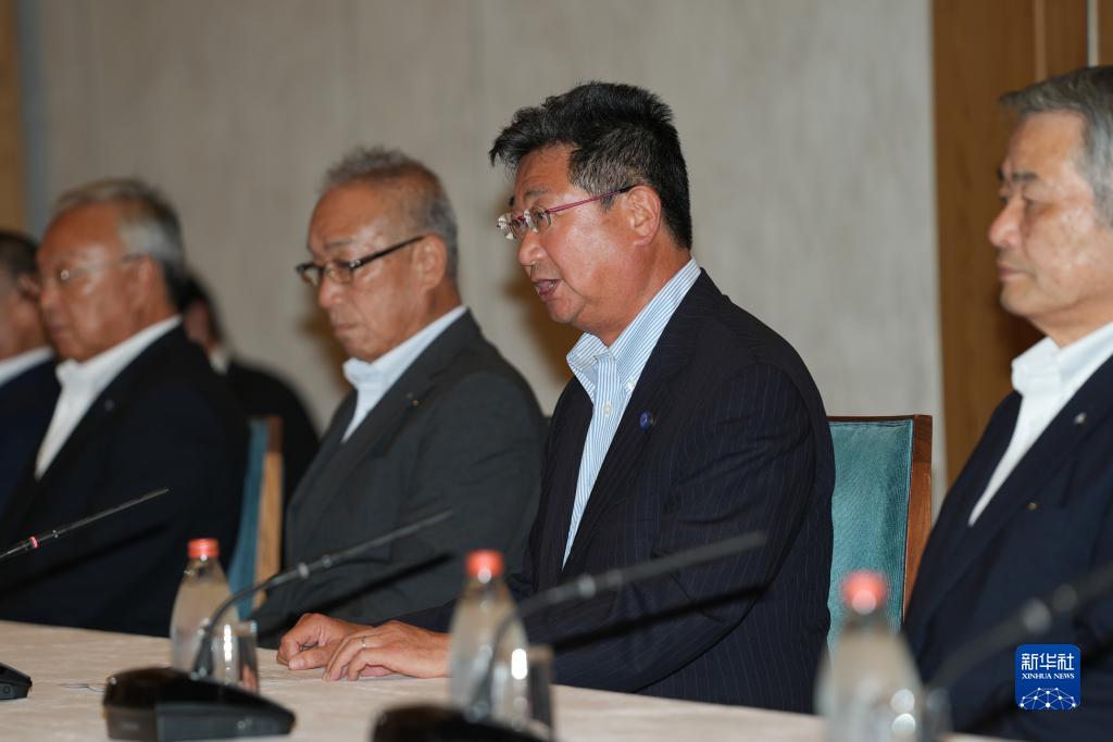 8月21日,在日本東京首相官邸,日本全國漁業(yè)協(xié)會聯(lián)合會會長坂本雅信(右二)在與日本首相岸田文雄會見時發(fā)言。新華社記者 張笑宇 攝
