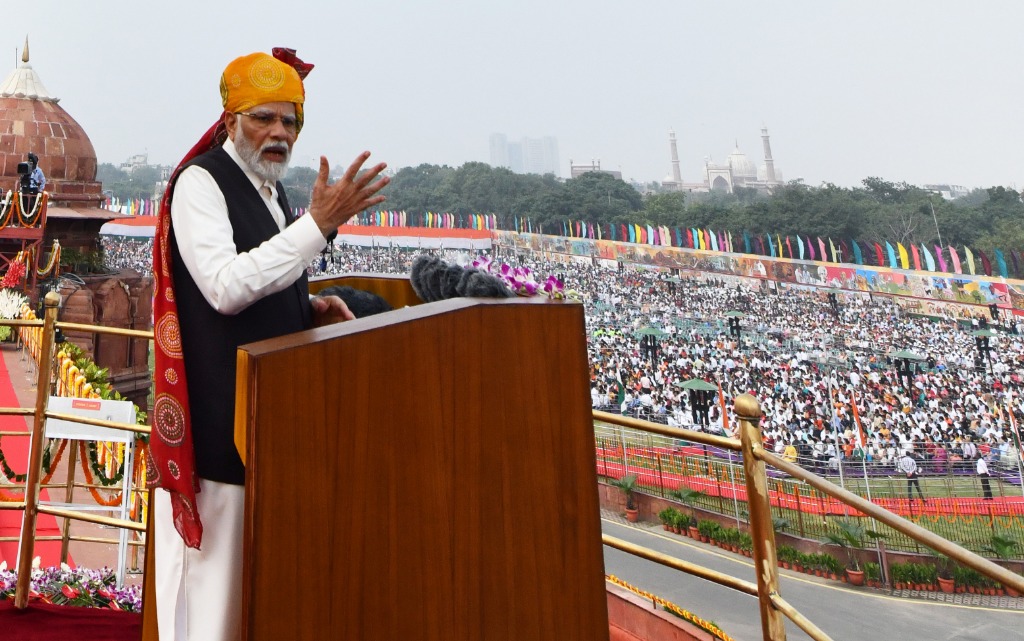 8月15日,印度總理莫迪在德里出席獨(dú)立日慶祝活動(dòng)時(shí)發(fā)表講話。新華社發(fā)
