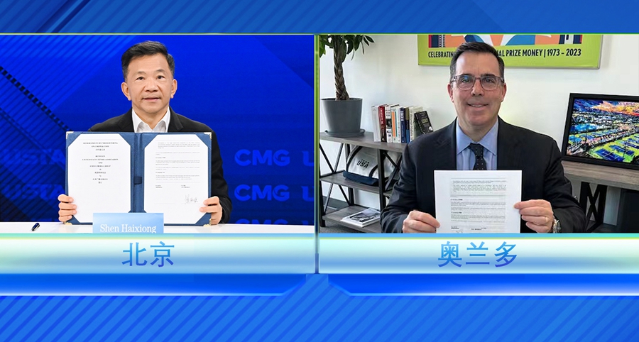 △中央廣播電視總臺(tái)臺(tái)長(zhǎng)慎海雄與美國(guó)網(wǎng)球協(xié)會(huì)首席執(zhí)行官洛·謝爾簽署合作備忘錄