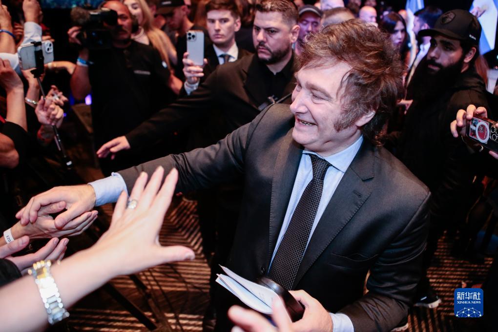 11月19日,阿根廷極右翼選舉聯(lián)盟“自由前進黨”候選人米萊在首都布宜諾斯艾利斯的競選總部外向民眾致意。新華社發(fā)(盧西亞諾·托雷斯攝)