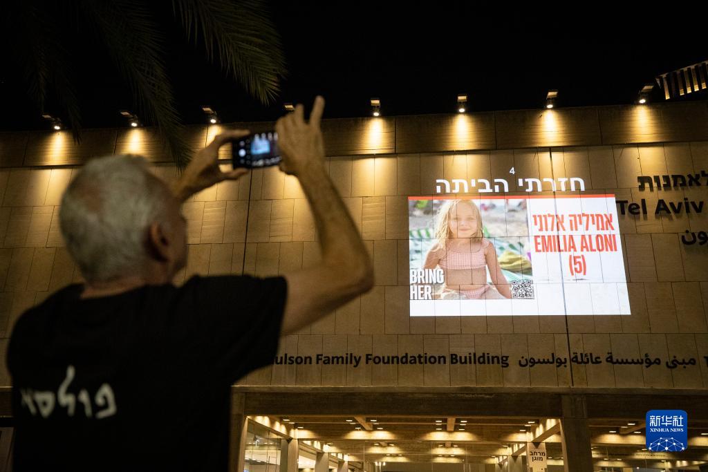 11月24日,在以色列特拉維夫,第一批被釋放人員的照片映現(xiàn)在建筑物上。新華社記者陳君清攝