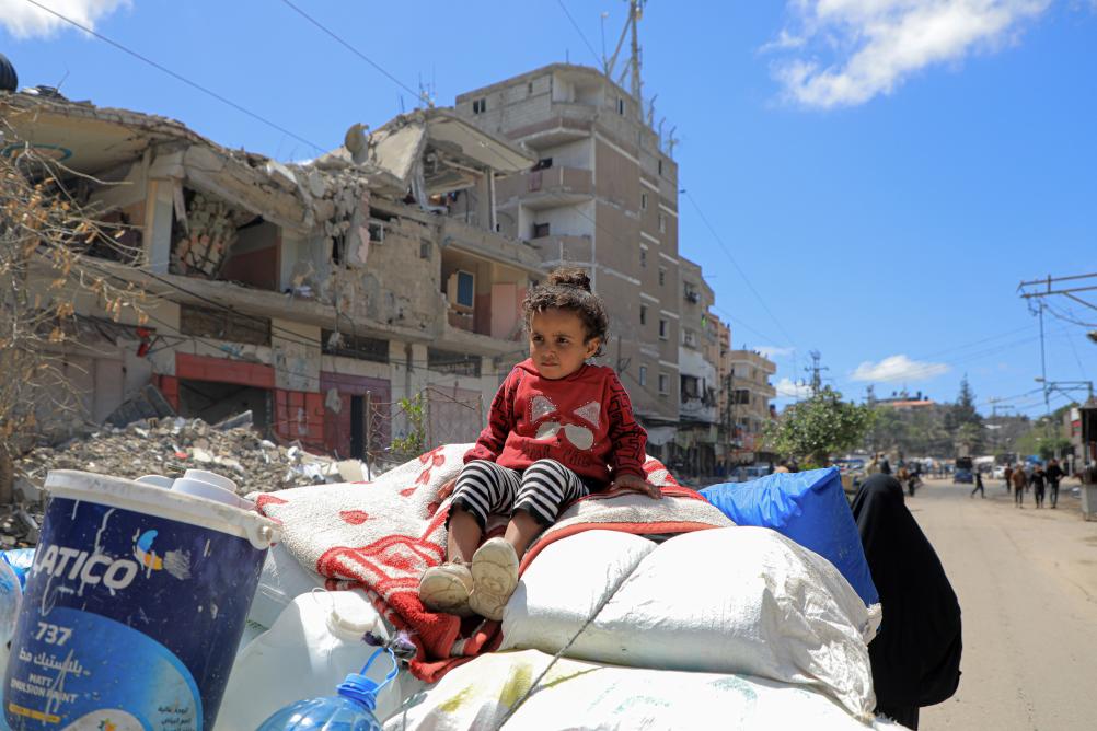 5月6日,在加沙地帶南部城市拉法,巴勒斯坦人離開家園。新華社發(fā)(里澤克·阿卜杜勒賈瓦德攝)