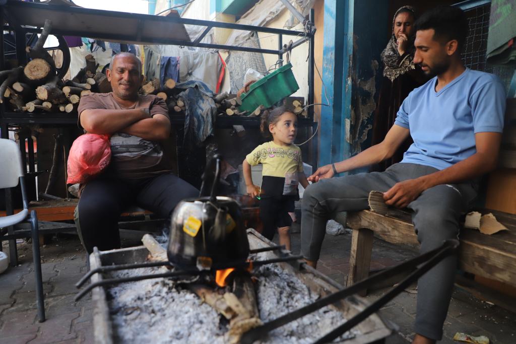 5月5日,巴勒斯坦人在加沙地帶北部杰巴利耶難民營一所收留無家可歸者的學校內(nèi)燒水。新華社發(fā)(阿卜杜勒拉赫曼·薩拉馬攝)