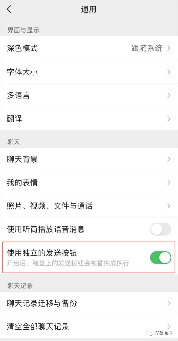更新后在【微信】-【我】-【設(shè)置】-【通用】-【使用獨(dú)立的發(fā)送按鈕】,默認(rèn)關(guān)閉,手動開啟后,鍵盤上的發(fā)送按鈕就會替換成換行。