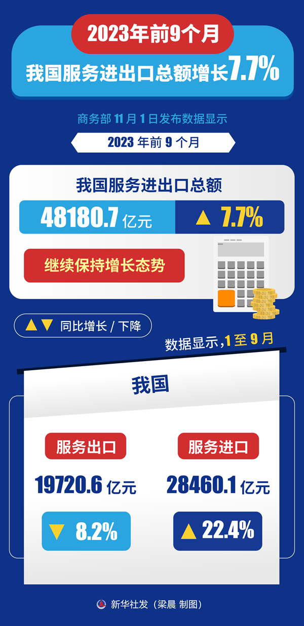新華社北京11月1日電 商務(wù)部1日發(fā)布數(shù)據(jù)顯示,今年前9個月,我國服務(wù)進(jìn)出口總額48180.7億元,同比增長7.7%,繼續(xù)保持增長態(tài)勢。