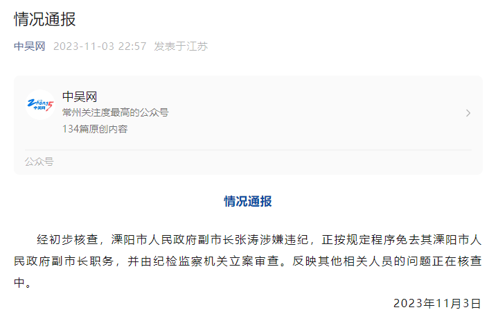 11月3日晚,江蘇常州廣播電視臺(tái)微信公眾號(hào)“中吳網(wǎng)”發(fā)布了情況通報(bào):