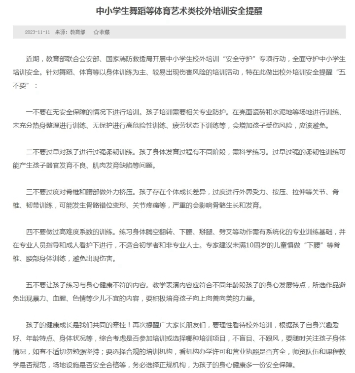 記者11月11日從教育部獲悉,近期,教育部聯(lián)合公安部、國家消防救援局開展中小學生校外培訓“安全守護”專項行動。針對舞蹈、體育等以身體訓練為主、較易出現(xiàn)傷害風險的培訓活動,提醒不要過早對孩子進行過強柔韌訓練。