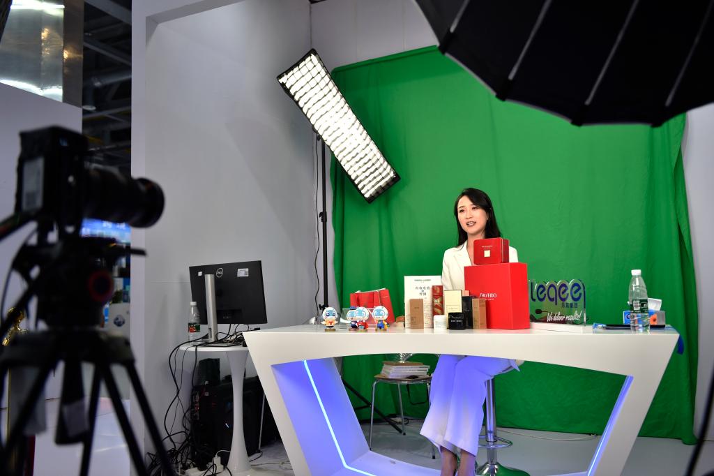 11月23日,在第二屆全球數(shù)字貿(mào)易博覽會絲路電商館,一名主播進行電商直播。新華社記者 劉嶺逸 攝