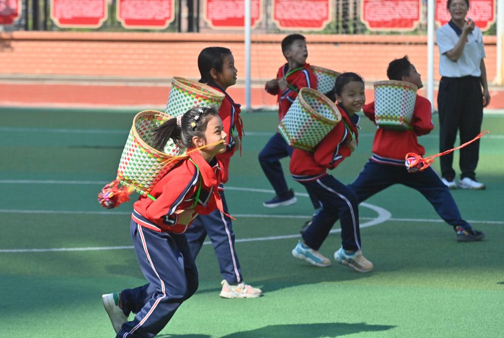10月16日,在廣西梧州市長洲區(qū)龍平小學,學生們在體育課上進行拋繡球比賽。新華社記者 黃孝邦 攝