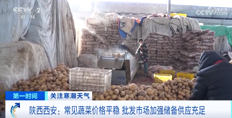 在西安一家大型農(nóng)副產(chǎn)品批發(fā)市場,為了應(yīng)對寒潮天氣帶來的影響,常年做蔬菜批發(fā)生意的戴建軍早在土豆產(chǎn)地建起庫房,大量收購?fù)炼梗黾舆\(yùn)輸車輛,確保土豆能及時運(yùn)到西安。