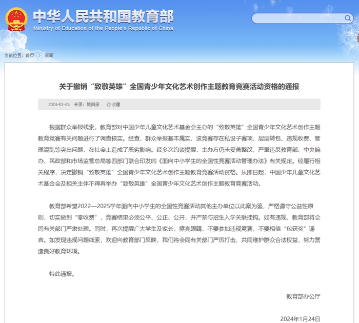根據(jù)群眾舉報(bào)線索,教育部對(duì)中國(guó)少年兒童文化藝術(shù)基金會(huì)主辦的“致敬英雄”全國(guó)青少年文化藝術(shù)創(chuàng)作主題教育競(jìng)賽有關(guān)問題進(jìn)行了調(diào)查核實(shí)。經(jīng)查,群眾舉報(bào)基本屬實(shí),該競(jìng)賽存在私設(shè)子賽項(xiàng)、層層轉(zhuǎn)包、違規(guī)收費(fèi)、管理混亂等突出問題,在社會(huì)上造成了惡劣影響。經(jīng)多次約談提醒,主辦方仍未妥善整改,嚴(yán)重違反教育部、中央編辦、民政部和市場(chǎng)監(jiān)管總局等四部門聯(lián)合印發(fā)的《面向中小學(xué)生的全國(guó)性競(jìng)賽活動(dòng)管理辦法》有關(guān)規(guī)定。經(jīng)履行相關(guān)程序,決定撤銷“致敬英雄”全國(guó)青少年文化藝術(shù)創(chuàng)作主題教育競(jìng)賽活動(dòng)資格。從即日起,中國(guó)少年兒童文化藝術(shù)基金會(huì)及相關(guān)主體不得再舉辦“致敬英雄”全國(guó)青少年文化藝術(shù)創(chuàng)作主題教育競(jìng)賽活動(dòng)。