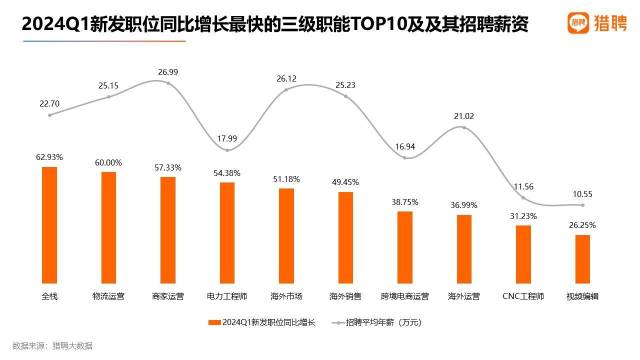 從一季度獵聘全平臺新發(fā)職位增長數(shù)據(jù)來看,全棧技術(shù)和物流運(yùn)營成為增長最快的兩個三級職能,增長率高達(dá)60%及以上。在增長居前的TOP10職能中,與對外貿(mào)易相關(guān)的職能占據(jù)了四席,分別是海外市場、海外銷售、跨境電商運(yùn)營和海外運(yùn)營,同比增長率在36.99%至51.18%之間,位列第五至第八位。同時,視頻編輯職能以26.25%的增長率躋身至第十位。