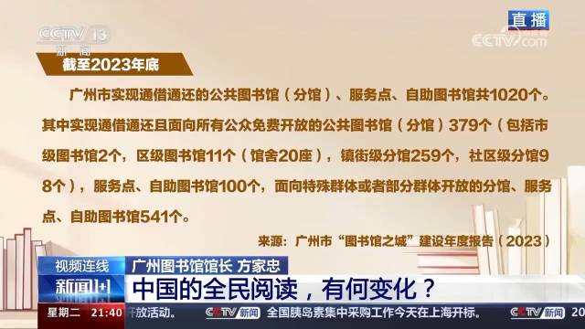 當(dāng)前,我國(guó)國(guó)民閱讀的習(xí)慣還發(fā)生了哪些變化?在刷屏?xí)r代,作為曾經(jīng)國(guó)民閱讀的主陣地,公共圖書館是否仍具備圈粉的吸引力?《新聞1+1》本期連線廣州圖書館館長(zhǎng)方家忠、中國(guó)圖書館學(xué)會(huì)副理事長(zhǎng)程煥文,共同關(guān)注:中國(guó)的全民閱讀,有何變化?
