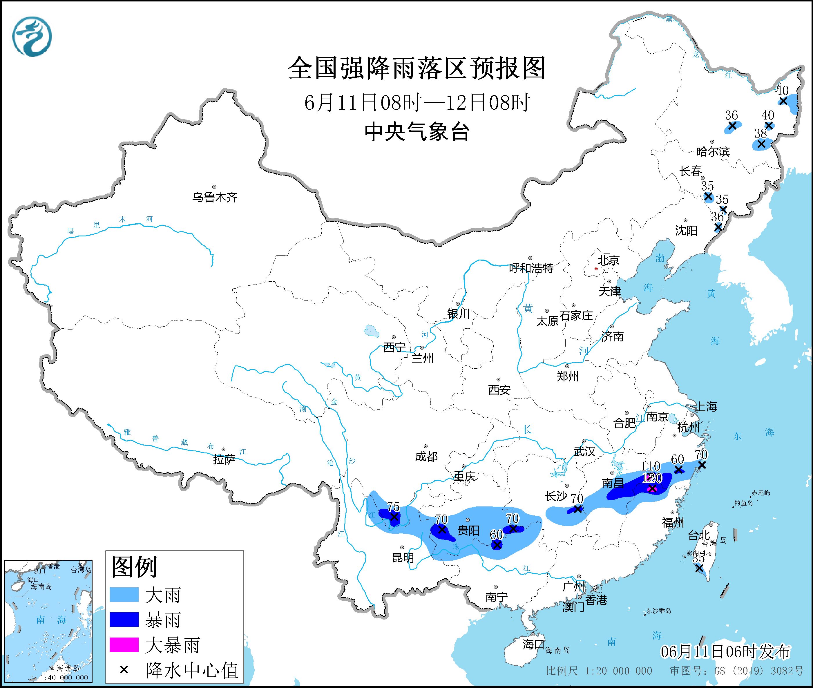 預(yù)計,6月11日8時至12日8時,浙江南部、福建北部、江西中北部、湖南南部、廣西北部、貴州中南部、云南東北部、四川南部,以及東北地區(qū)東部、臺灣島西南部等地部分地區(qū)有大到暴雨,其中,江西東北部、浙江西南部、福建西北部等地局地有大暴雨(100~120毫米)。上述部分地區(qū)伴有短時強(qiáng)降水(最大小時降雨量30~50毫米,局地可超過70毫米),局地有雷暴大風(fēng)等強(qiáng)對流天氣。