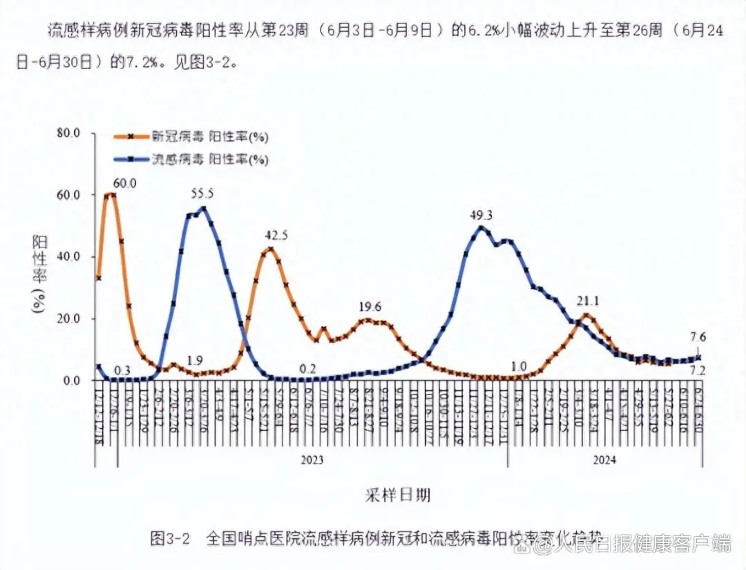 7月10日,中國疾控中心發(fā)布2024年6月全國新型冠狀病毒感染疫情情況。報(bào)告顯示全國哨點(diǎn)醫(yī)院流感樣病例占門(急)診就診人數(shù)比例小幅波動(dòng),流感樣病例新冠病毒陽性率從第23周(6月3日-6月9日)的6.2%小幅波動(dòng)上升至第26周(6月24日-6月30日)的7.2%。從報(bào)告數(shù)據(jù)來看,其中新冠病毒JN.1變異株XDV占比上升。