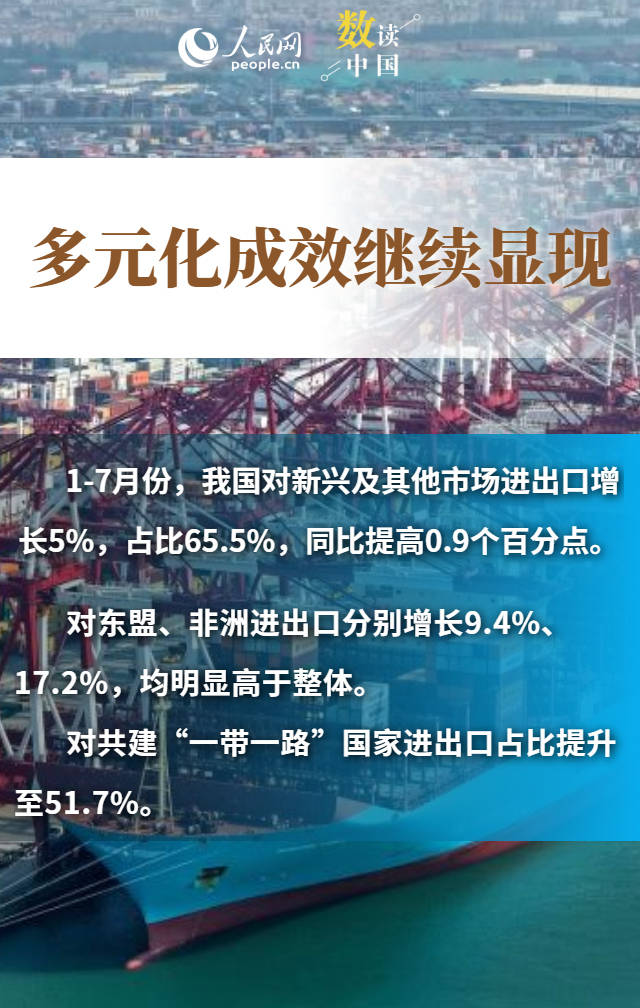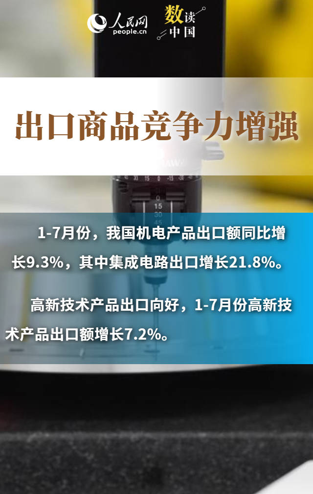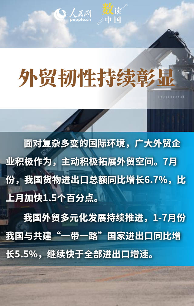 進(jìn)出口規(guī)模創(chuàng)歷史新高、“朋友圈”不斷擴大、民營企業(yè)持續(xù)創(chuàng)新……數(shù)據(jù)顯示,今年前7個月,我國貨物貿(mào)易進(jìn)出口總值25.7萬億元,同比增長3.5%。在外部挑戰(zhàn)之下,我國貨物進(jìn)出口持續(xù)增長,展現(xiàn)出較強韌性和活力,為世界經(jīng)濟復(fù)蘇注入了中國力量。