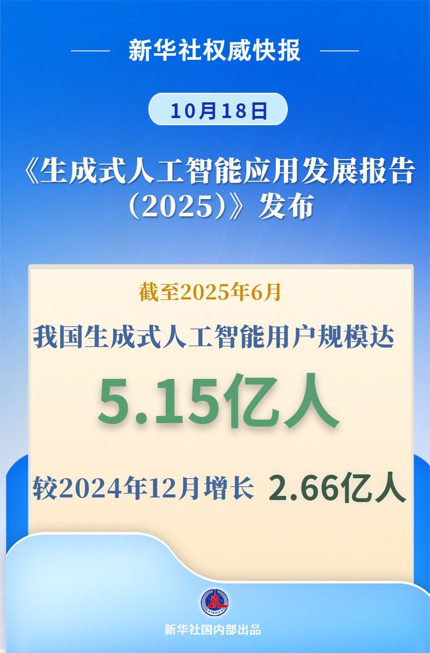10月18日,中國互聯(lián)網(wǎng)絡(luò)信息中心在2025(第六屆)中國互聯(lián)網(wǎng)基礎(chǔ)資源大會上發(fā)布《生成式人工智能應(yīng)用發(fā)展報告(2025)》。報告顯示,截至2025年6月,我國生成式人工智能用戶規(guī)模達5.15億人,較2024年12月增長2.66億人,用戶規(guī)模半年翻番;普及率為36.5%。
