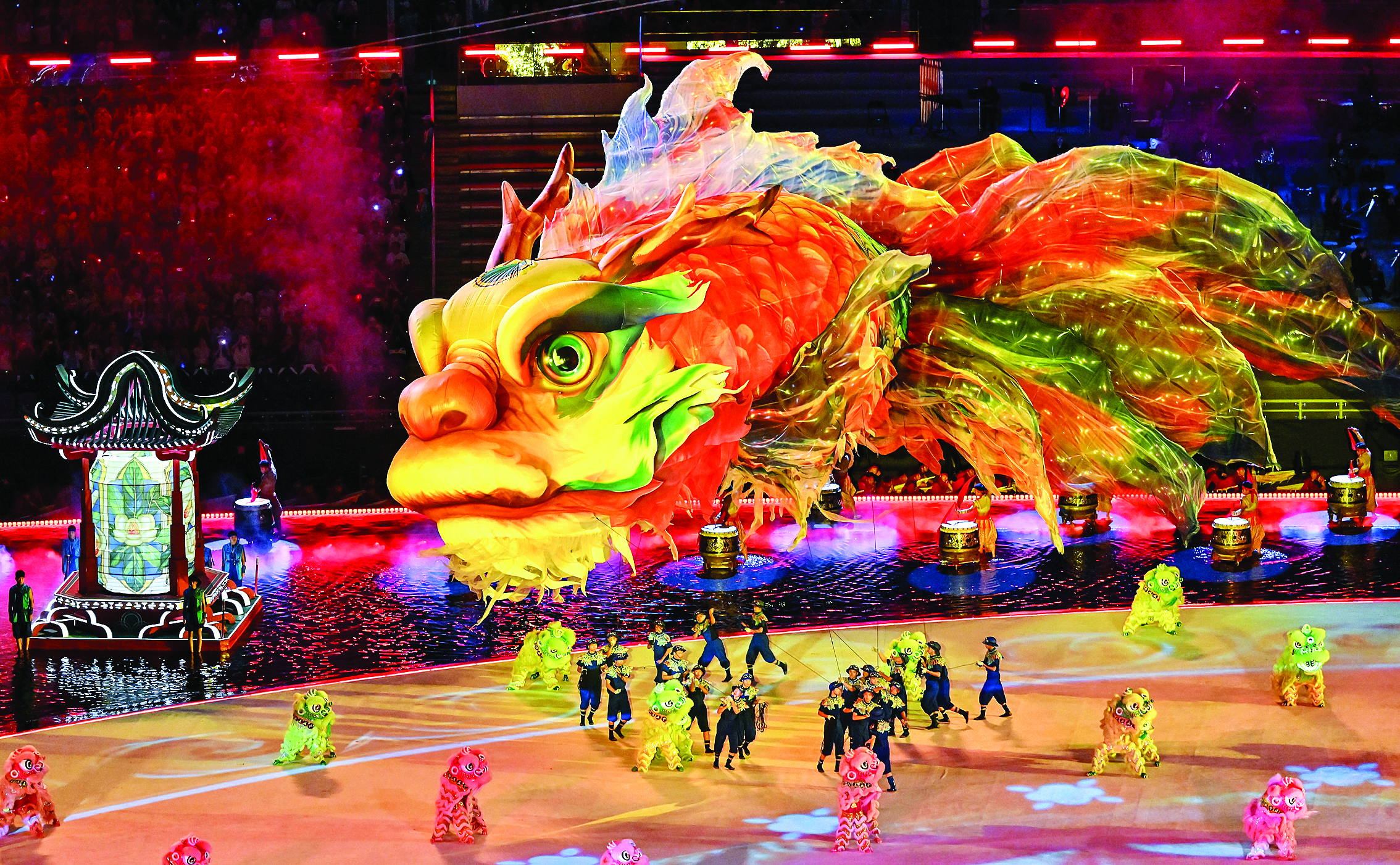 舞臺上空一條巨大的鰲魚在舞動。新華社發(fā)