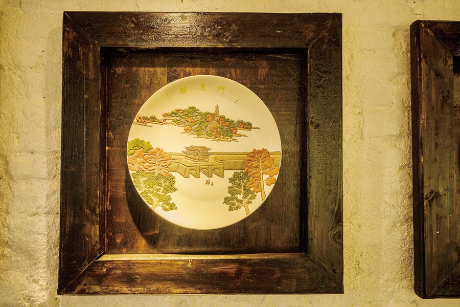 店面招牌用惠州彩瓷盤子堆彩“水”“長(zhǎng)”“東”三字。