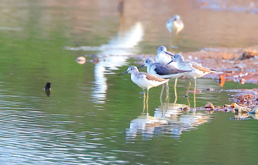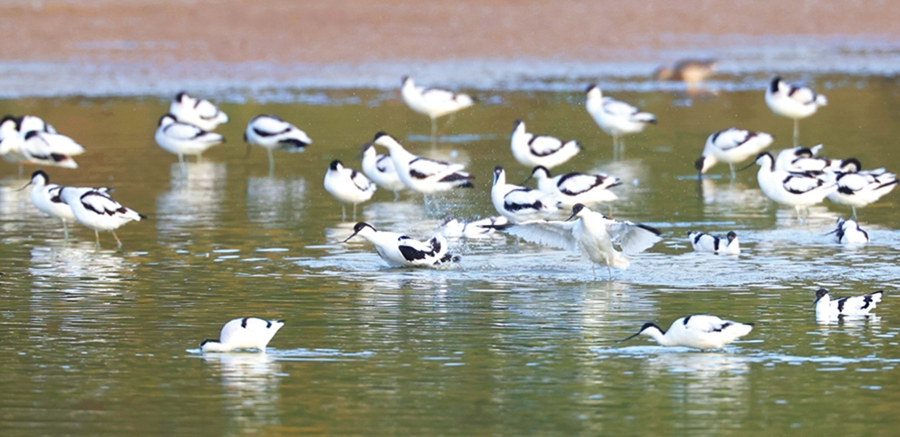 40來(lái)只黑臉琵鷺成一字隊(duì)形排開(kāi),200多只長(zhǎng)腳反嘴鷸結(jié)隊(duì)向前推進(jìn),20多只琵嘴鴨、白鷺、灰鷺穿插群中,在惠城區(qū)三棟鎮(zhèn)西枝江畔一個(gè)水塘里共享饕餮盛宴。