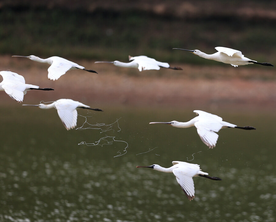 在西枝江飛翔的黑臉琵鷺和白琵鷺。