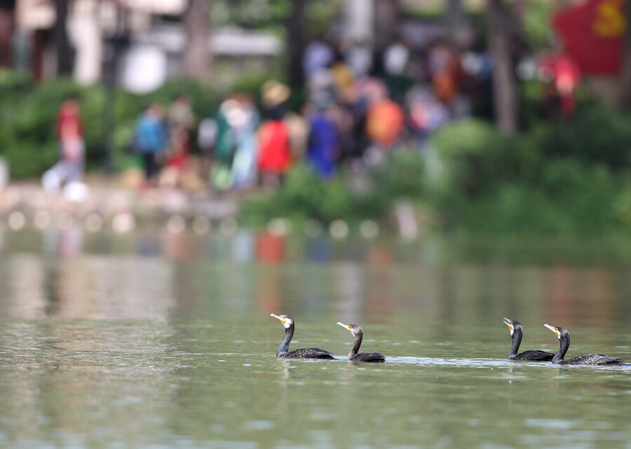 “幾處早鶯爭暖樹,誰家新燕啄春泥。”白居易《錢塘湖春行》中這句耳熟能詳?shù)脑娋洌枥L了春天鳥語花香、生機(jī)勃勃的景象。近日,惠州重現(xiàn)了詩句中的美景——在市區(qū)江北東江公園客家女雕像附近,每天早晨總能看見一群鸕鶿,它們時(shí)而在水中嬉戲覓食,時(shí)而翩翩起舞,一幅人與自然和諧共融的生動(dòng)畫卷盡收眼底,令人贊嘆不已。