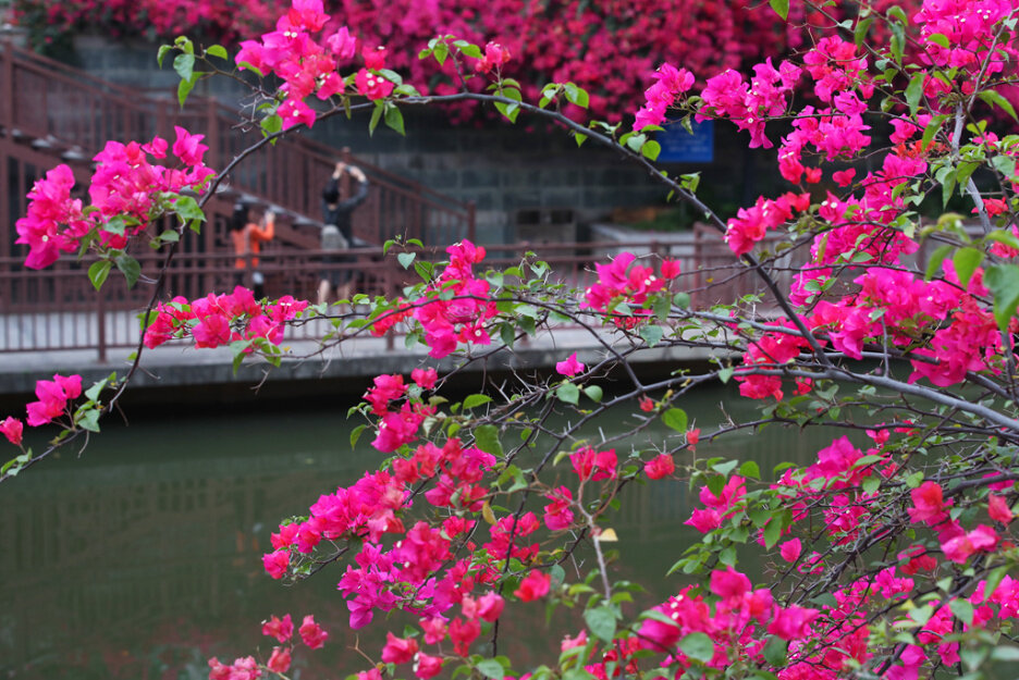 姹紫嫣紅的三角梅競相開放,吸引市民前來觀光“打卡”。