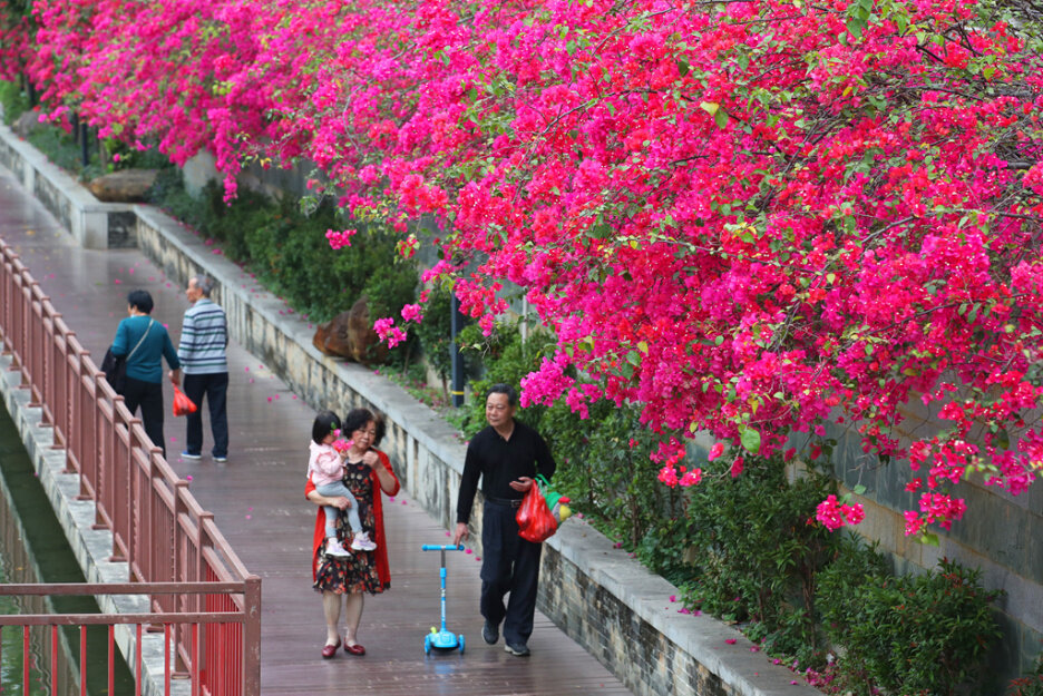 市民從“花廊”下走過,姹紫嫣紅的三角梅競相開放。