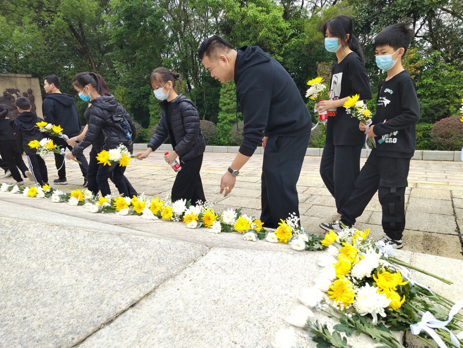 家長帶著孩子來到東江人民革命烈士紀(jì)念碑前獻(xiàn)花。